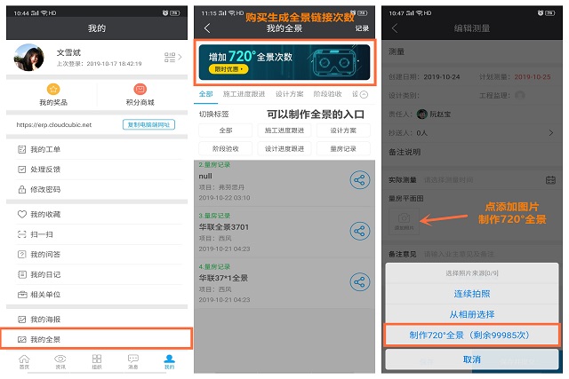· 手上有全景圖片,可以打開云裝天下app,點(diǎn)“我的”-“我的全景”購(gòu)買全景使用次數(shù),再通過“施工進(jìn)度跟進(jìn)、設(shè)計(jì)方案、階段驗(yàn)收、設(shè)計(jì)進(jìn)度跟進(jìn)、量房記錄”等入口,制作H5全景鏈接。