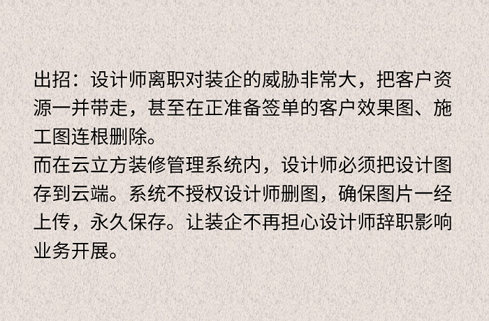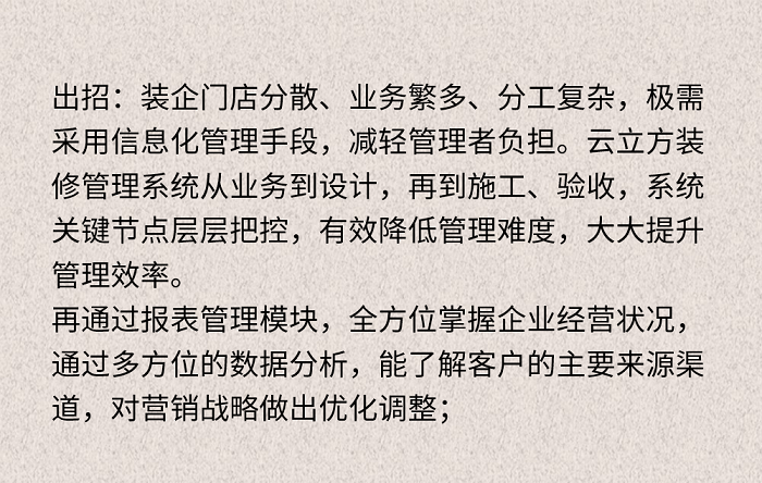 與此同時(shí),有位科技老兵立身行業(yè)數(shù)年,堪稱心得五車、經(jīng)驗(yàn)八斗,深得上萬裝企信賴與認(rèn)可。問其姓甚名誰?——云立方裝修管理系統(tǒng)。