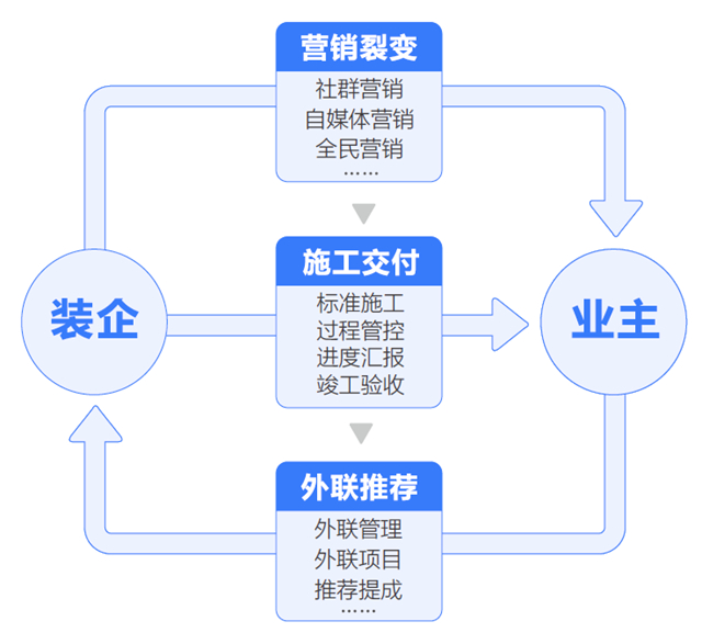 1、前期先梳理公司相關(guān)品牌,再通過移動互聯(lián)網(wǎng)宣傳推廣、上架官網(wǎng)、小程序,對私域流量進(jìn)行破冰,形成自主營銷體系,打破互聯(lián)網(wǎng)獲客的壟斷,獲取裝修客戶線索,解決獲客難的問題。