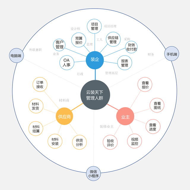 而云裝天下管理系統(tǒng),已經(jīng)覆蓋到裝飾企業(yè)的所有業(yè)務(wù)流程,賦能裝企簡(jiǎn)化裝修流程、縮短產(chǎn)業(yè)鏈條、降低運(yùn)營(yíng)成本、提升整個(gè)裝修效率及品質(zhì)。