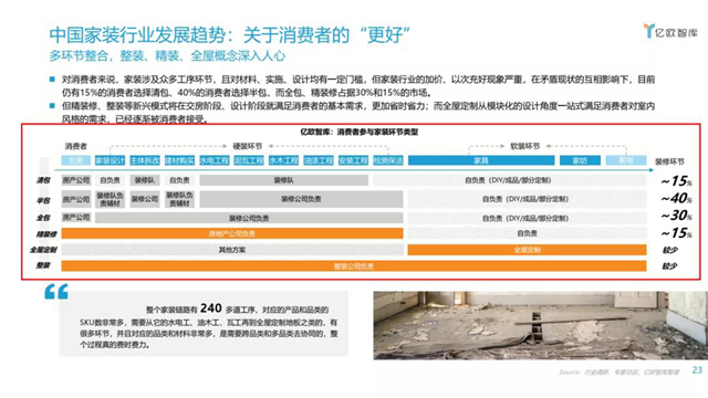 對(duì)消費(fèi)者來(lái)說(shuō),家裝涉及眾多工序環(huán)節(jié),且對(duì)材料、實(shí)施、設(shè)計(jì)均有一定門(mén)檻, 整裝新興模式在交房階段、設(shè)計(jì)階段就滿(mǎn)足消費(fèi)者的基本需求,更加省時(shí)省力;