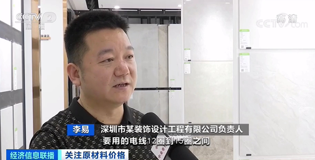 深圳市某裝飾設(shè)計(jì)工程有限公司負(fù)責(zé)人 李易:比方說80到120平方米的房子,要用電線12圈到15圈之間。2.5平方毫米規(guī)格的,年初價(jià)格是160多元一圈,目前價(jià)格是205元一圈。每一戶光只是電線這一部分就有600元、700元的成本上漲。