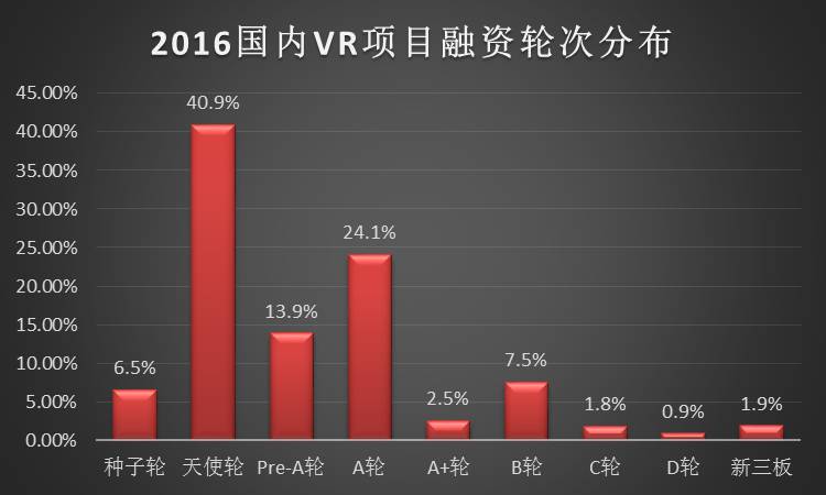 對(duì)于創(chuàng)業(yè)者來(lái)說(shuō),VR早已成為大部分人心中的風(fēng)口。近幾年VR行業(yè)的創(chuàng)業(yè)者倍增。其中跑的比較快的團(tuán)隊(duì)和公司,已經(jīng)開(kāi)始進(jìn)入B輪以后,而大部分公司主要集中在A輪以前,其中比例最大的是獲得天使輪融資的團(tuán)隊(duì)或公司,占比達(dá)到40.9%。不難發(fā)現(xiàn),國(guó)內(nèi)的VR企業(yè)們尚處在初級(jí)階段,但由于VR本身的市場(chǎng)潛力很受資本看中,所以一直發(fā)展較快,預(yù)計(jì)今年過(guò)后,大部分的VR企業(yè)將進(jìn)入B輪。