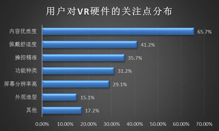 用戶(hù)對(duì)于VR設(shè)備的關(guān)注度與日俱增。在VR硬件設(shè)備的關(guān)注點(diǎn)分布圖中我們可以發(fā)現(xiàn),用戶(hù)最關(guān)心的還是內(nèi)容。幾乎絕大多數(shù)的用戶(hù)都對(duì)VR內(nèi)容的多樣性、優(yōu)質(zhì)程度抱有較大關(guān)注。和一般的視頻內(nèi)容不同,由于VR內(nèi)容的制作要求比較高的技術(shù)和成本,所以國(guó)內(nèi)的VR內(nèi)容并不是十分成熟,當(dāng)前已經(jīng)有越來(lái)越多的創(chuàng)業(yè)團(tuán)隊(duì)傾注在此,相信優(yōu)質(zhì)的爆款內(nèi)容出現(xiàn)后,將會(huì)大大提升用戶(hù)對(duì)于虛擬現(xiàn)實(shí)的認(rèn)知。