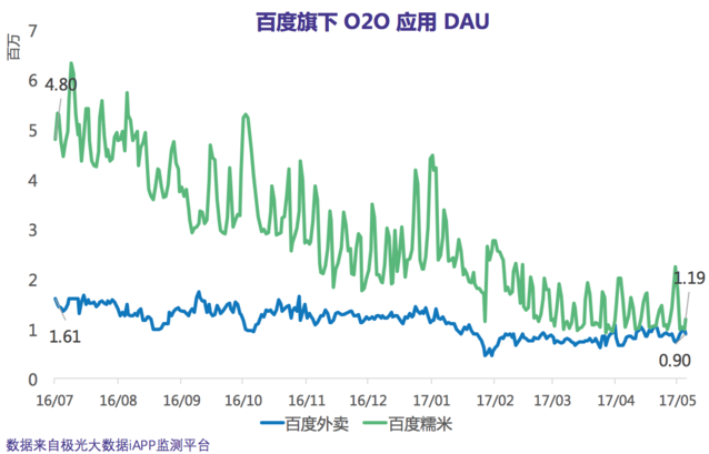 在同一時期內(nèi),百度糯米的DAU數(shù)據(jù)則由最初的480萬下跌至今年5月5日的119萬,下跌比例明顯超過百度外賣。