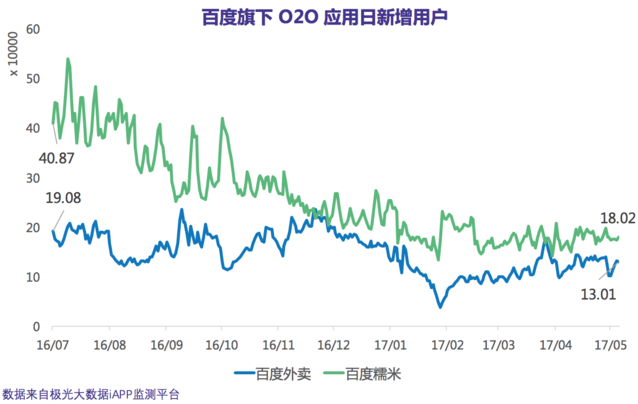 在日新增用戶數(shù)上,百度糯米的下跌趨勢尤為明顯。極光大數(shù)據(jù)iAPP平臺監(jiān)測得到的數(shù)據(jù)顯示,百度糯米在去年7月初期的日新增用戶數(shù)為40.87萬,到今年5月5日則為18.02萬。與此同時,百度外賣的日新增用戶數(shù)也從去年7月初的19.08萬下跌至最新的13.01萬。