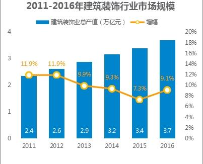 根據(jù)中國(guó)建筑裝飾協(xié)會(huì)數(shù)據(jù)顯示,2011年~2016年,建筑裝飾行業(yè)市場(chǎng)規(guī)模保持穩(wěn)定增長(zhǎng),其中家裝在整體裝修市場(chǎng)中所占比例在逐步攀升,將引領(lǐng)未來裝飾行業(yè)的走向。另一方面,在消費(fèi)升級(jí)下,越來越多的用戶對(duì)家居裝飾提出了更高的要求,這種情況下,透明、便利的互聯(lián)網(wǎng)家裝成為主流用戶的選擇。