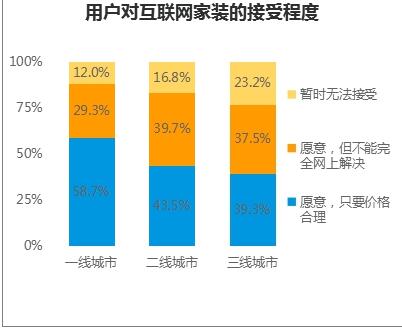 報(bào)告指出,用戶對(duì)于互聯(lián)網(wǎng)家裝的接受程度越來越高,根據(jù)2016年土巴兔官方網(wǎng)站調(diào)研可知,一線城市中近9成用戶接受互聯(lián)網(wǎng)家裝,6成用戶對(duì)互聯(lián)網(wǎng)家裝完全認(rèn)可,在二三線城市中,互聯(lián)網(wǎng)用戶也在不斷提升,互聯(lián)網(wǎng)家裝接受度在80%左右?;ヂ?lián)網(wǎng)家裝已經(jīng)贏得主流用戶群體的青睞。