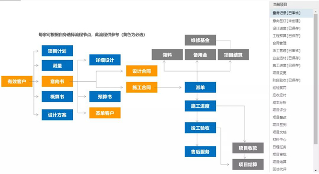 系統(tǒng)內(nèi)置標(biāo)準(zhǔn)的項(xiàng)目管理流程,可選擇性使用,測(cè)量、意向書、概算、預(yù)算、設(shè)計(jì)方案、詳細(xì)設(shè)計(jì)、施工合同、派單、施工進(jìn)度計(jì)劃、驗(yàn)收、評(píng)分、收付款結(jié)算、備用金、材料款、維修基金等。