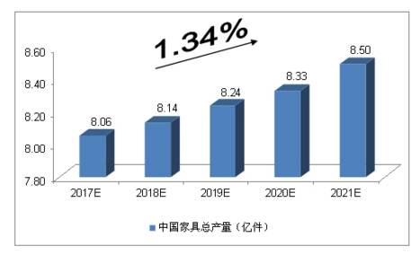2014年,中國(guó)家具總產(chǎn)量為7.78億件,同比增長(zhǎng)3.10%;2015年1-10月,中國(guó)家具總產(chǎn)量達(dá)到6.25億件,同比增長(zhǎng)0.97%。綜合以上因素,我們預(yù)計(jì),2017年中國(guó)家具總產(chǎn)量將達(dá)到8.06億件,未來(lái)五年(2017-2021)年均復(fù)合增長(zhǎng)率約為1.34%,2021年中國(guó)家具總產(chǎn)量將達(dá)到8.50億件。