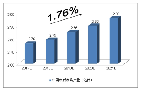 2014年,中國(guó)木質(zhì)家具產(chǎn)量為2.63億件,同比增長(zhǎng)1.59%;2015年1-10月,中國(guó)木質(zhì)家具產(chǎn)量達(dá)到2.04億件,同比增長(zhǎng)1.86%。綜合以上因素,我們預(yù)計(jì),2017年中國(guó)木質(zhì)家具產(chǎn)量將達(dá)到2.76億件,未來(lái)五年(2017-2021)年均復(fù)合增長(zhǎng)率約為1.76%,2021年中國(guó)木質(zhì)家具產(chǎn)量將達(dá)到2.96億件。